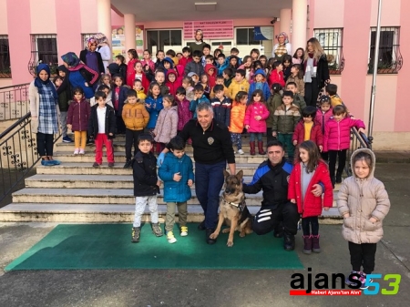 Rize İl Emniyet Müdürlüğü’ne bağlı Toplum Destekli Polislik Şube görevlileri tarafından gerçekleştirilen “Minik Kalpler Emniyet Kalkanında Projesi” kapsamında Trafik Tescil ve Denetleme Şube Müdürlüğü personeli ve Narkotik dedektör köpeği Cora, Gülbahar Anaokulunu ziyaret etti.