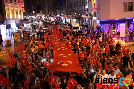 Rize'de çok sayıda vatandaş, yatsı namazının ardından Sahil Camisi önünde bir araya geldi. Ellerinde Türk bayrakları ve sloganlar eşliğinde Cumhuriyet Caddesi'nde devam eden yürüyüşte 100 metre uzunluğunda bayrak açıldı.