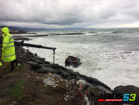 Denize düşen araç, çekici yardımıyla çıkartıldı.