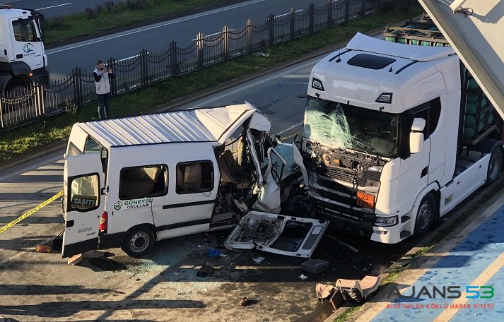 Güneysu'dan Rize'ye öğrenci taşıyan İsmail Bıyık idaresindeki 53 DR 986 plakalı okul servisi, Portakallık Mahallesi sahil yan yolda park halindeki 34 TN 6301 plakalı tıra çarptı.