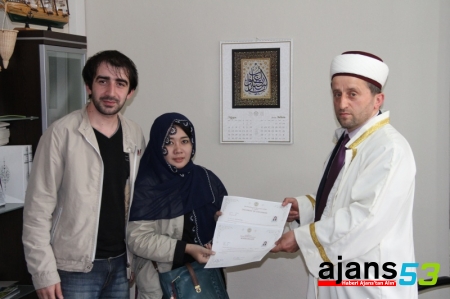İhtida merasiminde okunan Kur’an-ı Kerim’in ardından İl Müftü Yardımcımız Ali Çakmak, İslam dininin güzelliklerinden söz ederek, Müslüman olma kararı verip Emel ismini alan Rize gelinine ihtida belgesini verdi.