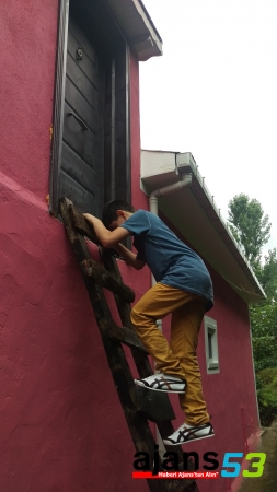 İlçenin Yenicami Köyü’nde yaşayan 72 yaşındaki Ahmet Temizel, “Pembe Köşk” ismini verdiği ve yeni restore ettiği evinin üst katına kapı yaptı ancak merdivenini yapmadı. Geçmiş yıllarda Yenicami köyünde fırıncılık yapan ve 1974 yılında köyüne ev yaptıktan sonra Sakarya’nın Karasu ilçesine yerleşerek burada inşaat ustalığına başlayan Ahmet Temizel, 40 yıl sonra yeniden baba ocağına döndü. Yarım kalan evini restore yapmaya başlayan ve “Pembe Köşk” ismini verdiği evinin üst katına teras yapan Temizel, kapısını koyduğu terasının merdivenini ise yapmadı. Temizel ailesi şimdilik teras katına tahta merdivenle çıkıyor.