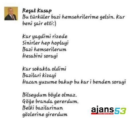 “Kar yağdı mi Rize de. Sinirler hep hoplayı. Bazı hemşerilerum hesabini sorayı. Kar sokakta oldu mi. Bazıları kizayi. Haçan yuzume bakup bu karı benden sorayı. Bilseydum böyle olmaz. Göğe branda gererdum. Belki bazılarinun. Gözlerine girerdum.”