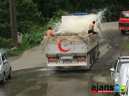 Sıcaktan bunalan Rizeliler kamyonun kasasına su doldurup serinlediler.