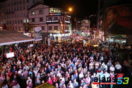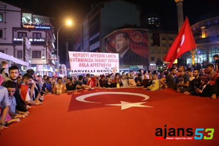 Rize'de, Cumhuriyet Meydanı'nda yağmur altında bir araya gelen binlerce vatandaş, ellerinde Türk bayraklarıyla, FETÖ'nün darbe girişimini protesto etti.