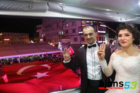 Rize'de yeni evlenen çift, Fetullahçı Terör Örgütünün (FETÖ) darbe girişimine tepki amacıyla tutulan "demokrasi nöbeti"ne gelinlik ve damatlıklarıyla katıldı.