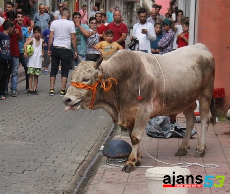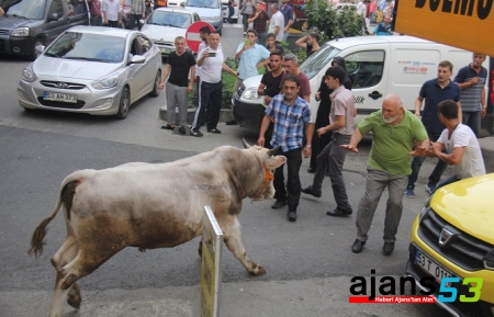 Rize şehir merkezinde aynı kamyonetin kasasında bulunan iki boğa, indirilmek istendikleri sırada sahiplerinin elinden kurtulup şehrin en işlek caddesi olan Atatürk Caddesi’ne girdi. İş yerlerine giren, caddelerde koşan boğalar, bayram alışverişine çıkan vatandaşlara korku dolu anlar yaşattı. Boğalardan biri kısa sürede yakalanırken, diğeri ise sahiplerini bir hayli uğraştırdı. Bir türlü yakalanamayan boğa, Rize Belediyesi ekipleri tarafından iğne ile uyutularak yakalandı.