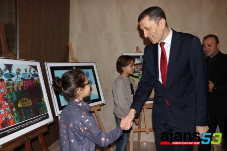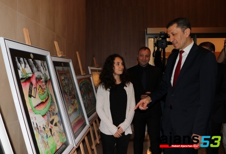 Ulusal resim yarışmalarında dereceye giren öğrencilerin eserlerinin yer aldığı sergiyi gezen Selçuk, çocuklarla bir süre sohbet etti.