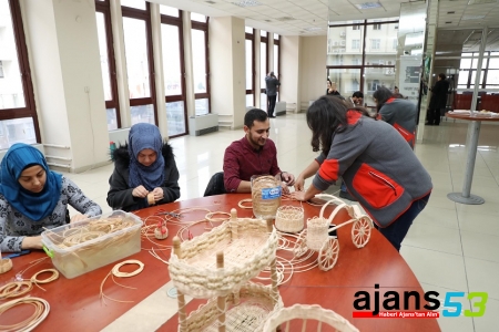 Rize Uluslararası Öğrenci Derneği ve Ebruli Yaşam ve Sanat Derneği bünyesindeki usta öğreticiler, etkinlik kapsamında yabancı öğrencilere sepet örücülüğü, ebru, deri yakma ve işlemeciliği, kaligrafi hakkında bilgi verdi.