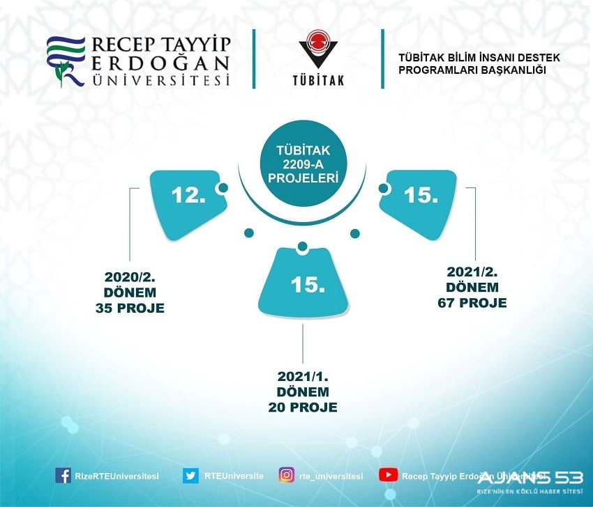 Proje kültürünün öğretim elemanları ve öğrencilerde yaygınlık kazanması için belli aralıklarla proje hazırlama ve yönetme eğitimlerin verildiği üniversitemizde son yıllarda TÜBİTAK projelerinde elde edilen başarılar dikkat çekmektedir. Bu doğrultuda Üniversitemiz, TÜBİTAK 2209-A Üniversite Öğrencileri Araştırma Projeleri Destekleme Programı kapsamında 2020/2 döneminde 35 projeyle on ikinci ve 2021/1 döneminde de 20 projeyle Türkiye’de on beşinci olmuştur. 2021/2 döneminde de kabul edilen 67 projesiyle RTEÜ kararlılığını devam ettirerek yine Türkiye’de tüm üniversiteler arasında on beşinci olma başarısını göstermiştir.