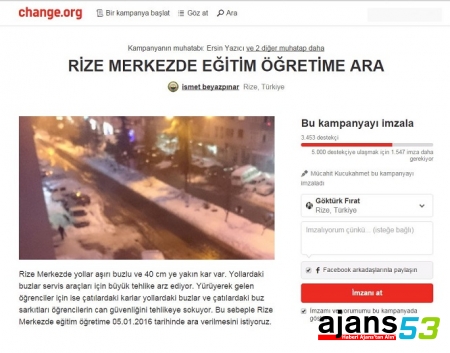 Rize’de soğuk hava ve buzlama nedeni ile bazı ilçelerde okullar tatil edildi. Tatilden faydalanamayan gençler internet üzerinden imza kampanyası başlattı.