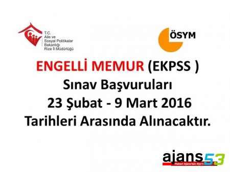 Engelli Kamu Personeli Seçme Sınavı (EKPSS) 24 Nisan 2016 tarihinde 81 il merkezinde yapılacaktır.Başvurular 23 Şubat-09 Mart 2016 tarihleri arasında alınacaktır.Kuraya başvuracak adayların başvuruları 03-16 Mayıs 2016 tarihleri arasında alınacaktır.