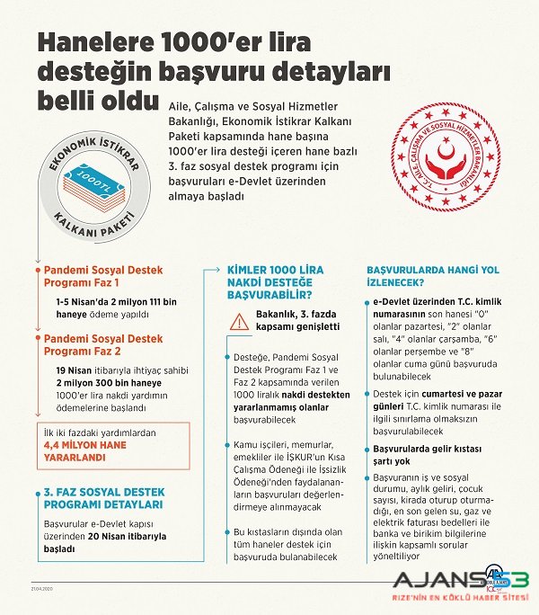 Aile, Çalışma ve Sosyal Hizmetler Bakanlığı, Ekonomik İstikrar Kalkanı Paketi kapsamında hane başına 1000'er lira desteği içeren hane bazlı 3. faz sosyal destek programı için başvuruları e-Devlet üzerinden almaya başladı.