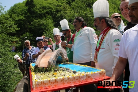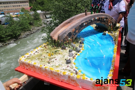 Daha sonra Çamlıhemşinli pasta ustaları tarafından 80 kilogram malzeme kullanılarak 2 günde tamamlanan "Fırtına Deresi üzerinde kemer köprü" figürlü pasta kesildi.