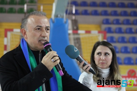 ÇAYKUR RİZESPOR KULÜP BAŞKANI METİN KALKAVAN, KENDİ YAPDIRDIKLARI KAPALI SPOR SALONUNDA SESİNİ BİR TÜRLÜ DİNLEYİCİLERE DUYURAMAYINCA ÖZELİŞTİRİ YAPTI.