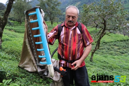 Rize'nin Fındıklı ilçesi Ihlamurlu köyünde yaşayan çay müstahsili Hayrettin Civelek, geliştirdiği makine sayesinde günde 1 ton çay topluyor.