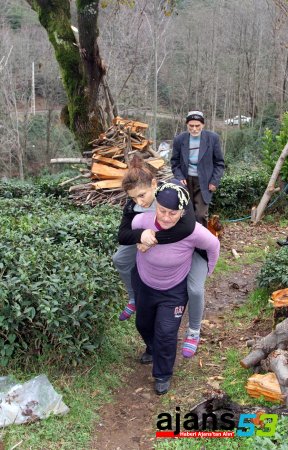 - Rize'de yaşayan 73 yaşındaki Mehmet ile 60 yaşındaki eşi Dursune Topçu çifti, evlerinin yakınlarında yol olmaması nedeniyle 35 yaşındaki yürüme güçlüğü çeken kızlarını hastaneye götürmek için bir süre sırtlarında taşıyor