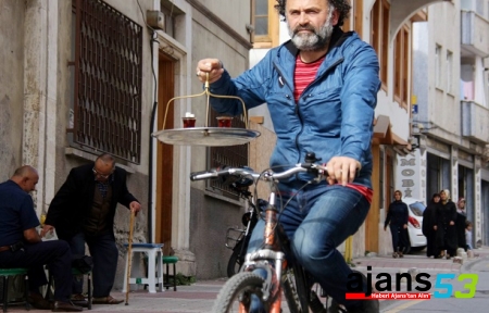 - Bir eliyle bisikleti kullanıyor, diğer eliyle tepsi dolusu çayları müşterilerine ulaştırıyor