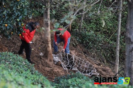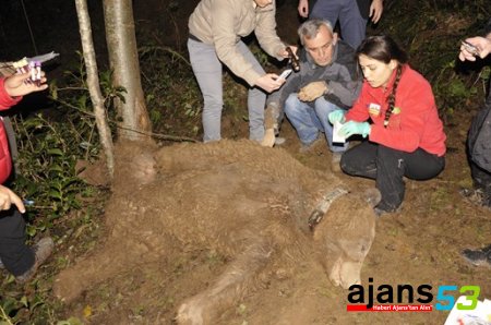 İlçe jandarma ekiplerinin güvenlik önlemi altında ayının tuzağa düştüğü alanda incelemelerde bulunan ekipler, iğneyle uyuttukları ayıyı uzun uğraşlar sonucu bulunduğu yerden çıkardı.