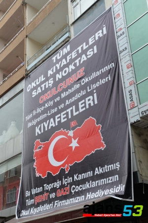 Altınordu ilçesinde bir mağazada asılan pankartla tüm şehit ve gazi çocuklarına okul kıyafetlerinin hediye edileceği belirtildi.