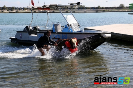 - Tosun, deniz polisinin yaklaşık 3 saatlik çalışması sonucu boynuna geçirilen can simidi ve iple çekilerek kıyıya çıkarıldı