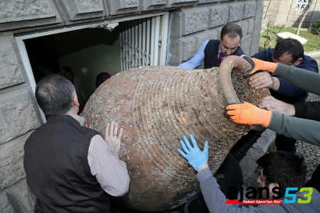Küp, müzenin 10 personeli tarafından araçtan indirildi. Personel, kırılmaması için lastik ve sünger kullandıkları küpü, yaklaşık 45 dakikalık çalışmanın ardından müzeye alabildi.