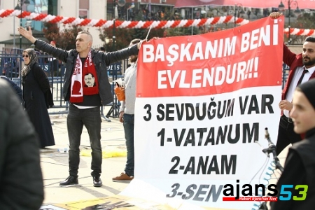 Üzerinde "Başkanum beni evlendur, üç sevduğum var, 1 vatanum , 2 anam, 3 sen’ yazılı pankartı açan vatandaşa Cumhurbaşkanlığı korumaları müdahale ederek Cumhurbaşkanı ile görüştürme sözü verdi.