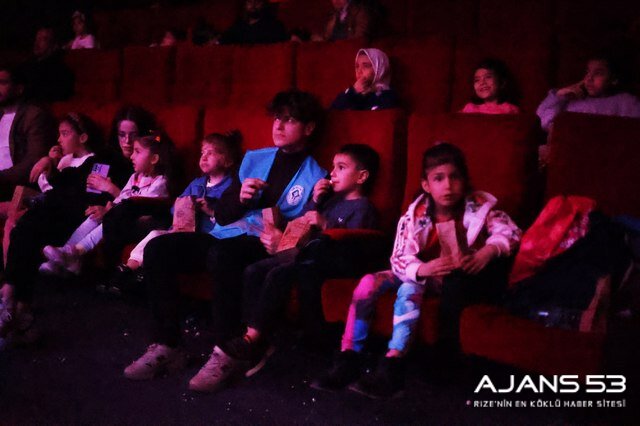 Aileleriyle birlikte Rize Belediyesi’nin tahsis ettiği araçlarla sinema salonuna gelen çocuklar, yapılan ikramlarla birlikte filmlerini izlediler.