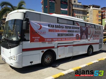 Cumhuriyet Meydanı’nda kurulan Türk Kızılay’ı Rize Şubesi’ne ait gezici kan toplama aracında kan veren gençlere Ajans53 Organizasyon firması tarafından gerçekleştirilecek Mustafa Ceceli konser bileti hediye edildi. Organizatör Hakan Güven, amaçlarının düzenlenen konserde gençleri eğlendirmek olduğu kadar kan bağışının önemini de dikkat çekmek olduğunu belirterek, kampanya kapsamında yaklaşık 550 kişinin kan bağışında bulunarak konser biletlerini aldığını söyledi.