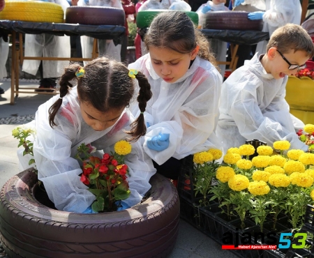 Ardından ise yine Tuzcuoğlu Memişağa Parkı’nda kullanılmayan araç lastiklerin boyanarak çiçek sepeti haline getirilmesi amacıyla, ilk okul öğrencilerinin katılımıyla boyama ve oluşturulan saksılara çiçek dikme etkinliği düzenlendi.