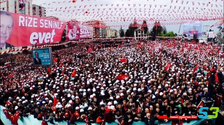 “15 Temmuz’da darbe teşebbüsü girişiminde Ankara ve İstanbul’da 12 Rizeli kardeşimiz şehadete yürüdü. Rize sağlam durduğu sürece bu aziz vatanın namusuna kimse el uzatamayacak. Hainlerin tuzakları başlarına geçirmeye devam edeceğiz. Bu milletin iradesine gem vurulmaz. Bu millet rükûda eğilir, secdede dik çöker, Başka kimsenin önünde boyun eğmez. 3-5 kendini bilmezin bu ülkenin gururunu incitmesine asla müsaade etmeyeceğiz. Batı’da bazı liderler istisna, bazılarına sözüm var. Türk milletini sindiremeyeceksiniz. Avrupa’da oy kullanan vatandaşlarımızı ne kadar engellerseniz engelleyin. Avrupa’da bile kardeşlerimiz o sandıkları patlatacaklar. 7 gün kaldı iyi gidiyorsunuz. Geçen yıllara göre daha fazla oy kullanılıyor. Sandıklardan evetle bu faşist baskıları uygulayanların torunlarına bu cevabı verin. Hepsinden öte Türkiye asıl cevabı verecek...Avrupa Birliği üyesi ülkeler bakıyorsunuz Hristiyanı, Ateisti hepsi beraber Vatikan’a gidiyorlar. Böyle bir zamanda Vatikan’ın Avrupa Birliği ile işi ne? Sizin Vatikan’da işiniz ne? Hepsi tek millet oldu. Ve Türkiye’yi Avrupa Birliği’ne almamak için ellerinden geleni yapıyorlar mı? 16 Nisan bunun için çok önemli. 16 Nisan’da vereceğiniz kararla bu işi masaya yatıracağız."