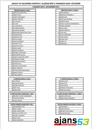 Cumhurbaşkanı Erdoğan'ın katılımıyla gerçekleştirilen AK Parti Rize İl Kongresinde tek liste ile başkan seçilen Muhammed Avcı'nın yeni yönetim kurulu listesi şu şekilde oluştu: