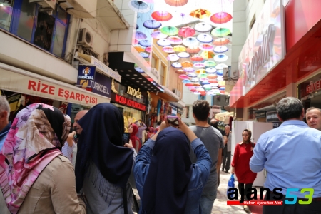 Rize’de ilk kez uygulaması yapılan, Şemsiyeli sokak’tan geçen vatandaşların cep telefonları gökyüzüne çevrildi. Rize Belediyesi ve Rize Kadınlar Eğitim, Kültür, Sosyal Yardımlaşma ve Dayanışma Derneği ni (RİKADER) ‘in işbirliği ile düzenlenen Şemsiyeli sokağın Rengarenk görüntüsünü vatandaşlar cep telefonları ile görüntüledi.