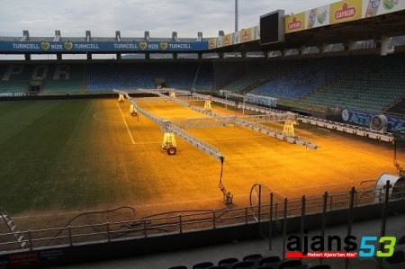 Spor Toto Süper Lig ekiplerinden Çaykur Rizespor'un stadının çimlerine, Hollanda'dan getirilen özel malzemelerle yapay güneş ışığı uygulanıyor.