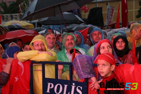 15 Temmuz Demokrasi ve Cumhuriyet Meydanı'nda yağmur altında toplanan binlerce vatandaş, Cumhurbaşkanlığı himayesinde, İstanbul Valiliği ve Büyükşehir Belediyesi desteğiyle İstanbul Yenikapı Miting Alanı'nda düzenlenen "Demokrasi ve Şehitler Mitingi"ne destek vermek için bir araya geldi.