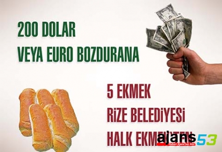 Rize Belediyesi Halk Ekmek Büfeleri’nde 200 Dolar’ını veya Euro’sunu bozdurup dekontu getiren vatandaşlara 5 ekmek ücretsiz olarak veriliyor.