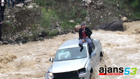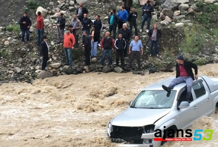Artvin’in Ardanuç ilçesinde dereye uçan aracının üzerine çıkan şahıs kendisine uzatılan iple kurtarıldı.