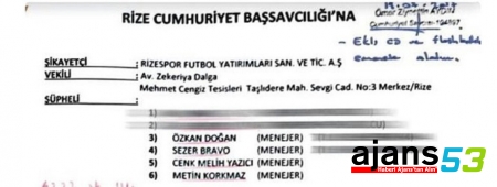 Rizespor Kulübü tarafından Rize Cumhuriyet Başsavcılığı’na yapılan bir şikayet. Şike yüzünden mağdur duruma düştüklerini öne süren Rizespor Kulübü, isimlerini tek tek verdiği bazı kişilerin cezalandırılmasını talep ediyor. Kamu davası açılmasını istiyor. Başvuru dosyasının içinde CD ve flash bellek de bulunuyor. Şikayete konu 4 menajer var. Kim mi bunlar? Özkan Doğan, Sezer Bravo, Cenk Melih Yazıcı, Metin Korkmaz.
