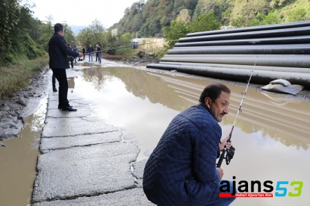 Rize merkeze bağlı 11 ayrı köyü birbirine bağlayan grup yolunda kapatılmayan çukurlar suyla dolunca köy sakinleri yoldaki çukurlarda birikmiş suya olta atarak yollarının yapılmamasını protesto ettiler.