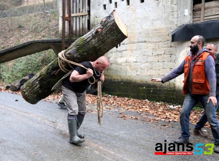 Çayeli ilçesine bağlı Büyükköy beldesinde yaşayan 43 yaşındaki Ramazan Çepni, arkadaşlarının yardımıyla kütüğü düz bir yere çıkardı. Çepni, iple sırtına aldığı kütüğü, zaman zaman zorlansa da 58 adım taşımayı başardı.