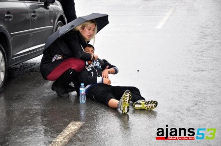 Zonguldak'ın Ereğli ilçesinde, otomobilin çarpması sonucu yaralanan çocuğun yağmurdan ıslanmaması için bir kadın başında şemsiyeyle bekledi.
