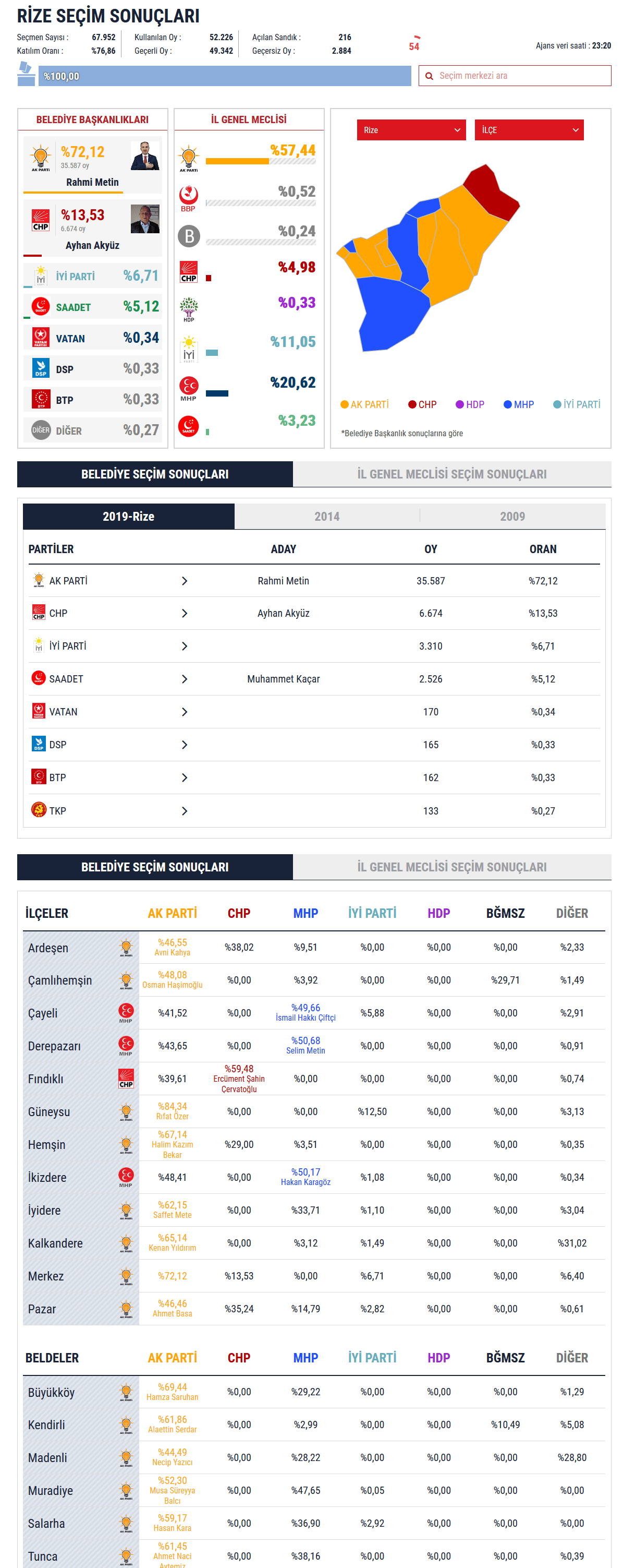 RİZE'NİN SEÇİM SONUÇLARI AÇILAN SANDIKLAR %100