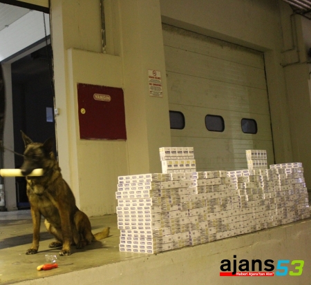 Sarp Sınır Kapısı'nda bir yolcu otobüsünde çay, tütün dedektör köpeği "Donna" ile yapılan aramada, piyasa değeri 21 bin lira olan gümrük kaçağı sigara ele geçirildi.