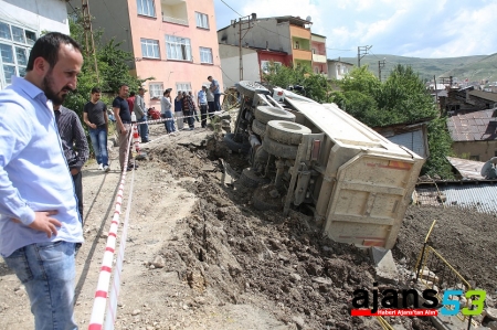 Bayburt'ta, belediyeye ait içme suyu şebeke hattı inşaatında çalışan kum yüklü kamyon, kontrolden çıkarak iki evin üzerine devrildi.