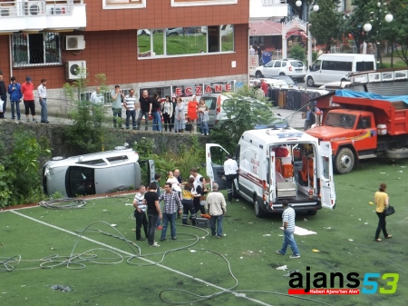 Rize’de meydana gelen ilginç kazada N.T. isimli kadın sürücü, Eminettin Mahallesi’nde bulunan bir göz hastanesine seyir halindeyken, aracı ile çıkmakta olduğu dik rampada direksiyon hakimiyetini kaybederek, bir süre önce halı saha şimdi ise otopark olarak kullanılan alana düştü. Beş metre yükseklikte düşen araç otoparkta yan yattı. Araçta bulunan N.T. ve 4 yaşındaki kızı G.T. vatandaşların yardımı ile araçtan çıkartıldı. Sağlık durumları iyi olan anne-kız her ihtimale karşı ambulans ile alınarak hastaneye götürüldü. İlginç kaza sonrası olay yerinde bulunan vatandaşlar tarafından cep telefonları ile kaydedildi.