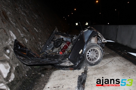 Beton bariyerleri devirerek üç parçaya bölünen otomobilin ön tarafı çarpma nedeniyle bariyerlerde kaldı, arka bölümü 30 metre ileride, bazı parçaları ise bölünmüş yolun karşı şeridine savruldu.