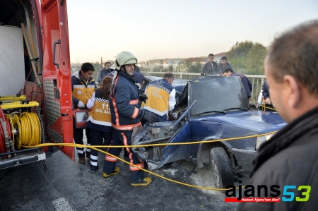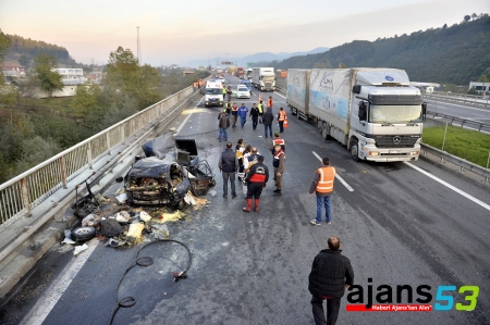 Tırın önünde yaklaşık yüz metre sürüklenen otomobil, aniden alev alarak yanmaya başladı. Araçta sıkışan sürücü ve yanında bulunan bir kişi alev alan otomobilde yanarak can verdi.