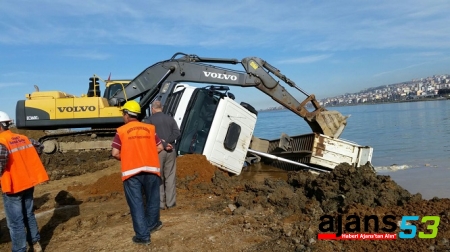 Sürücünün, damperini kaldırdığı sırada lastikleri toprağa batmaya başlayan kamyon, yan yattı. Son anda denize düşmeden kamyonu durdurmayı başaran sürücü, kazadan yara almadan kurtuldu.