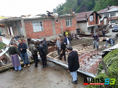 Rize'nin Çamlıhemşin ilçesinde şiddetli rüzgar evlerin çatısını uçurdu.