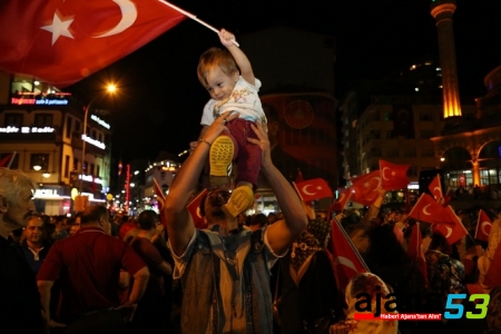 Alanda bulunan bir Annenin kucağında duran bir bebeğin ise Türk Bayrağını öpmesi dikkatlerden kaçmazken, gözlemlenen bu hareket vatandaşlar arasında geleceğimizin teminatı çocuklarımızın Vatan Bayrak aşkıyla büyüdüğü şeklinde yorumlandı.